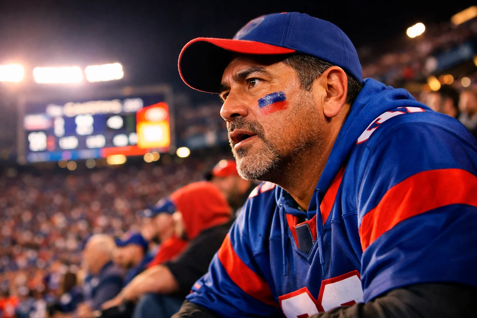 Tablero de estadio NFL mostrando marcador de puntos totales durante partido nocturno